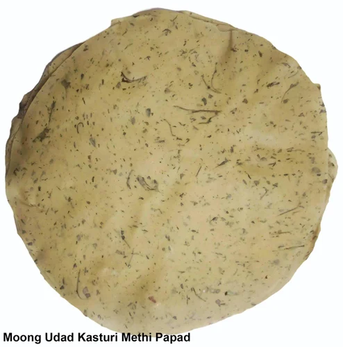 Handmade Moong Udad Dal Kasturi Methi Papad is a premium-quality, traditionally prepared papad made from a blend of moong dal and udad dal with the rich aroma of kasturi methi (fenugreek leaves). Each papad is carefully handcrafted to preserve its authentic taste, crisp texture, and homemade charm. With its light yellow color and round shape, this papad not only enhances your meal but also adds a burst of flavor to your plate. Whether roasted or fried, it offers the perfect combination of nutrition and taste.